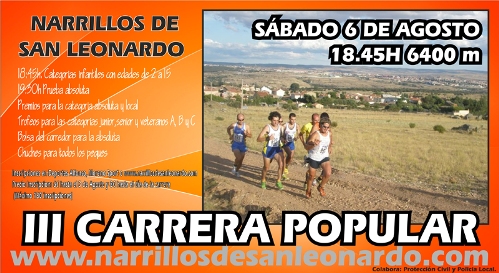 A. Goal / La Asociación de Vecinos de Narrillos de San Leonardo organiza para este sábado 6 de agosto la tercera edición de su carrera popular, que transcurrirá sobre una distancia de 7.000 m., el resultado de dar una vuelta al pueblo y dos al circuito preparado al efecto por los alrededores.