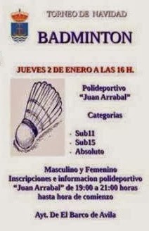 @deportesavila / El Torneo de Navidad de Badminton para las categorías sub11, sub15 y absoluta, se disputará el jueves 2 de enero en el polideportivo Juan Arrabal de El Barco de Ávila, a partir de las 16:00 horas.