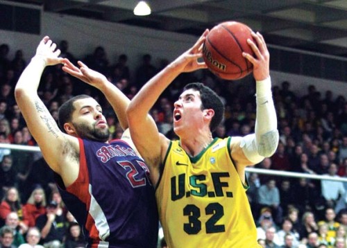 | Angelo Caloiaro a la derecha con el balón, jugando con la Universidad de San Francisco |