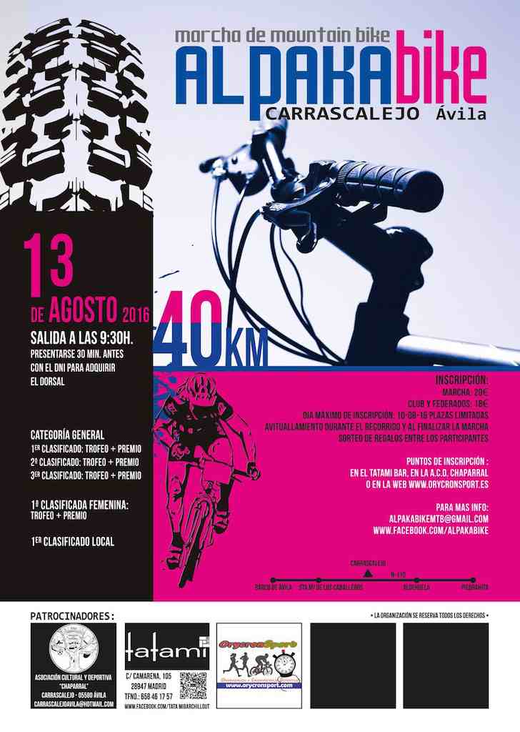 Las inscripciones se pueden realizar a través de https://orycronsport.es/marcha-mtb-alpakabike/ hasta la medianoche de hoy y presencialmente en A.C.D. Chaparral (Plaza del Pueblo, Carrascalejo) hasta el mismo día de la carrera hasta las 9:00. El precio es de 20 euros, que se reduce a 18 para los clubes y federados.