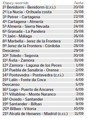 La Vuelta 2011 partirá de Benidorm el 20 de agosto con una crono individual para finalizar el 11 de septiembre en Madrid, tras la disputa de una contrarreloj individual que partiría de Alcalá de Henares. La pretensión de Unipublic es que se disputen con dos jornadas intermedias de descanso. Lo más novedoso es el regreso al País Vasco, después de 34 años de ausencia, con la llegada a Bilbao de la antepenúltima etapa, desde donde saldría la penúltima en dirección Vitoria. En su recorrido se prevén finales como Sierra Nevada, La Pandera, Laguna de los Peces, Fonte da Cova, Puerto de Ancares y Monte Naranco, la mayoría de ellos prácticamente inéditos en la ronda española.