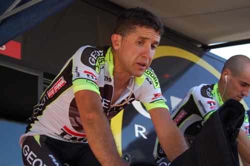 | Carlos Sastre calentando antes de comenzar la crono por equipos de la Vuelta a España |