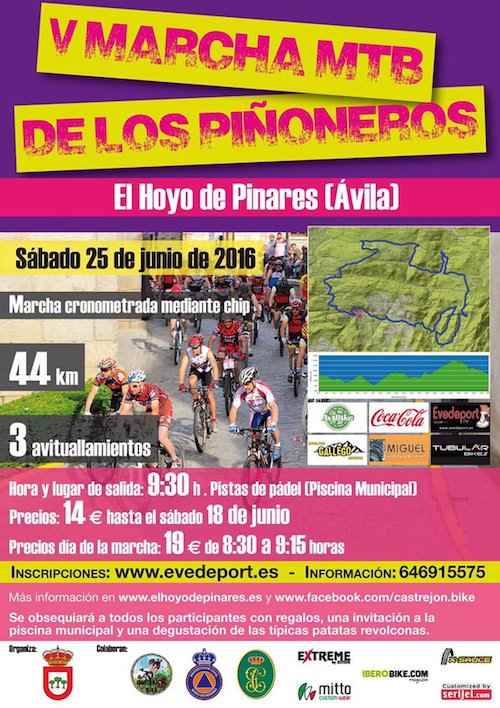 @deportesavila / La localidad abulense del Hoyo de Pinares acoge el próximo sábado 25 de junio la quinta edición de la Marcha MTB Los Piñoneros, una actividad que transcurre por los preciosos parajes hoyancos, sobre un recorrido de 44,980 kilómetros en los que los participantes se encontrarán duras subidas y tramos de dificultad técnica de nivel medio-alto.