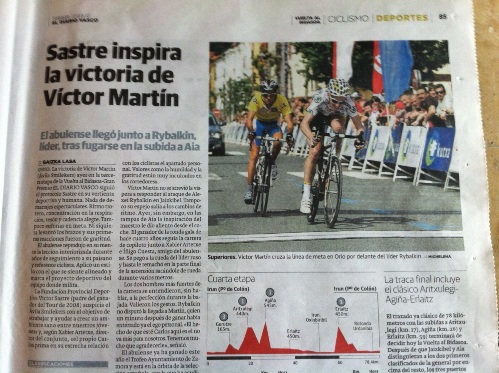 El Diario Vasco destaca la victoria del corredor Víctor Martín en la tercera etapa de la Vuelta al Bidasoa: Orio-Orio y hace referencia a la presencia de Carlos Sastre en la carrera. «Sastre inspira la victoria de Víctor Martín«, titula el rotativo vasco.