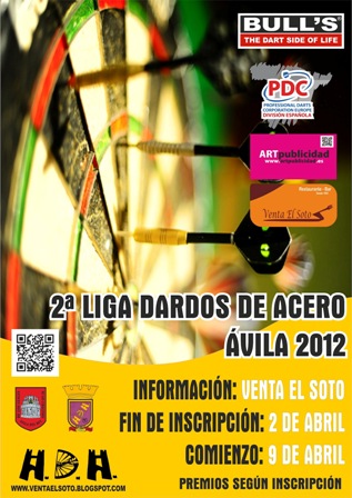 La II Liga de Dardos de Acero Ávila 2012 se jugará los lunes y martes en la Venta del Soto, sede de ADA (https://www.ventaelsoto.blogspot.com/), en horario de 20:30 a 22:30. La inscripción se cerrará el lunes 2 de abril y la liga comenzará el lunes 9 de abril. La inscripción y la recaudación de las partidas se repartirá integra en premios.
