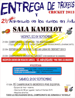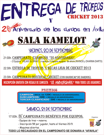 @deportesavila / La Sala Kamelot de la capital abulense albergará mañana viernes 20 de septiembre el acto de entrega de trofeos de la Liga de Cricket 2013, coincidiendo con el vigésimo aniversario de los dardos en Ávila.