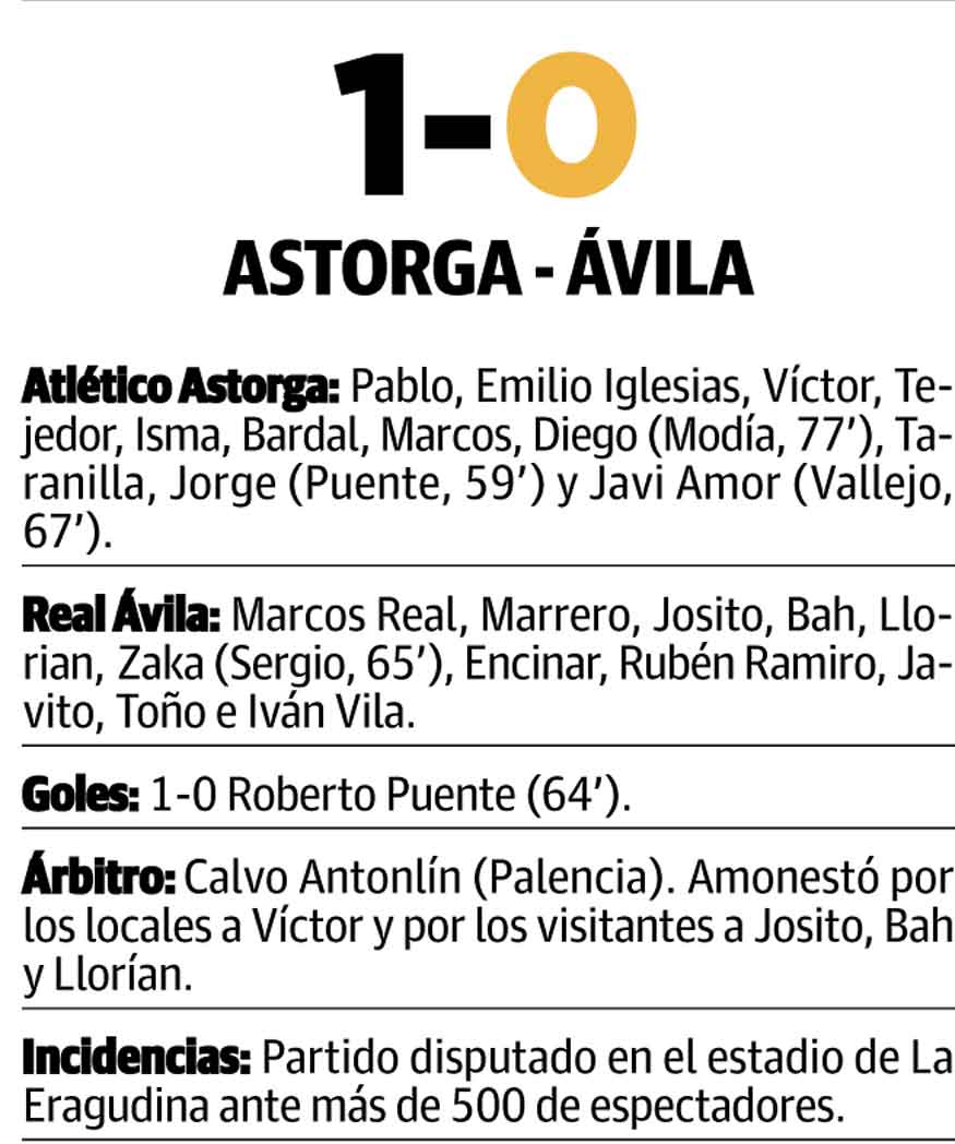 El Atlético Astorga supo contemporizar el partido hasta el final y apenas sufrió para mantener el resultado y sumar una nueva victoria. El Real Ávila fue incapaz de generar ocasiones a un Astorga al que le bastó con manejar la posesión para cerrar el encuentro.