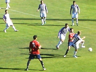 | Emilio da un pase a Gustavo en el partido entre encarnados y blanquivioletas |