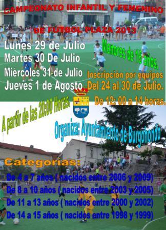 @deportesavila / Dentro de las múltiples actividades deportivas que organiza durante el verano el Ayuntamiento de Burgohondo destaca el Campeonato Infantil y Femenino de Fútbol Plaza 2013, que los días 29, 30 y 31 de julio y 1 de agosto se desarrollará en esta localidad abulense, a partir de las 20:00 horas.
