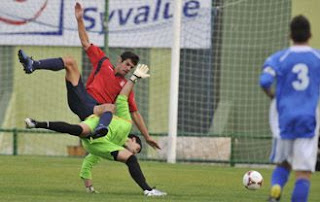 | Choque entre Iban Vila y el portero del Unami (Foto: El Adelantado de Segovia) |