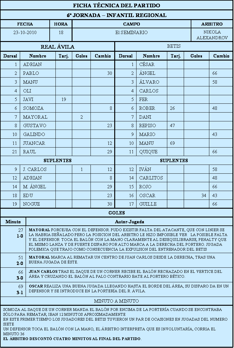 Partido disputado de poder a poder con mucha seriedad por los equipos que nos ofrecieron un gran primer tiempo. Los dos contendientes bien plantados en el campo tratando el equipo del Betis que el Real Ávila no sacara el balón jugado desde atrás y presionando bien. El primer tiempo fue muy táctico con marcajes severos por partes del Betis que pretendieron anular sobre todo a David Galindo y la banda izquierdo dejándole cerca dos jugadores, lo que facilitó las jugadas por la banda derecha de David Mayoral con su acostumbrada fuerza y ambición. En ese primer tiempo vimos a Adrián el portero mandando y dejándose oír, animando a sus compañeros y colocando a la defensa; vive el partido muy concentrado y seguro sin hacer concesiones a la galería. La defensa bien colocada del Real Ávila, donde Pablo y Javi, que alguna oportunidad tuvieron el año pasado, se han afianzado, un Manu que ha crecido física y deportivamente, y Somoza que día a día se acostumbra a esta categoría tan distinta a la provincial. El medio de campo disputó el partido midiendo los tiempos; Gus, Juancar y Raúl con mucho desgaste y tocando el balón a los espacios y con paciencia tratando de no precipitarse; de Oli decir que tiene una gran colocación, que se ofrece a sus compañeros dejándose ver y que recupera muchos balones aprovechándose de su envergadura y de saber meter hábilmente el cuerpo para cubrir el balón. Arriba dos armas letales, Mayoral, fuerza, entrega y ambición cara al gol y David Galindo, con su inteligencia y manera de ver el futbol, bajando a ayudar cuando es necesario, fácil y bonito en el regate, habilidad y elegante carrera con una rapidez extraordinaria que ha hecho que se le conozca en la categoría y se le someta a férreos marcajes. El resto de jugadores, Juan Carlos, Adrián, Nogueroles, Edu y Miguel Ángel, que jugaron a lo largo del segundo tiempo, salen enchufados y con ganas de ganarse cada día más minutos y tratando de cumplir las indicaciones que les dan los entrenadores, para mantener el resultado o cambiar en otros casos el rumbo de un partido