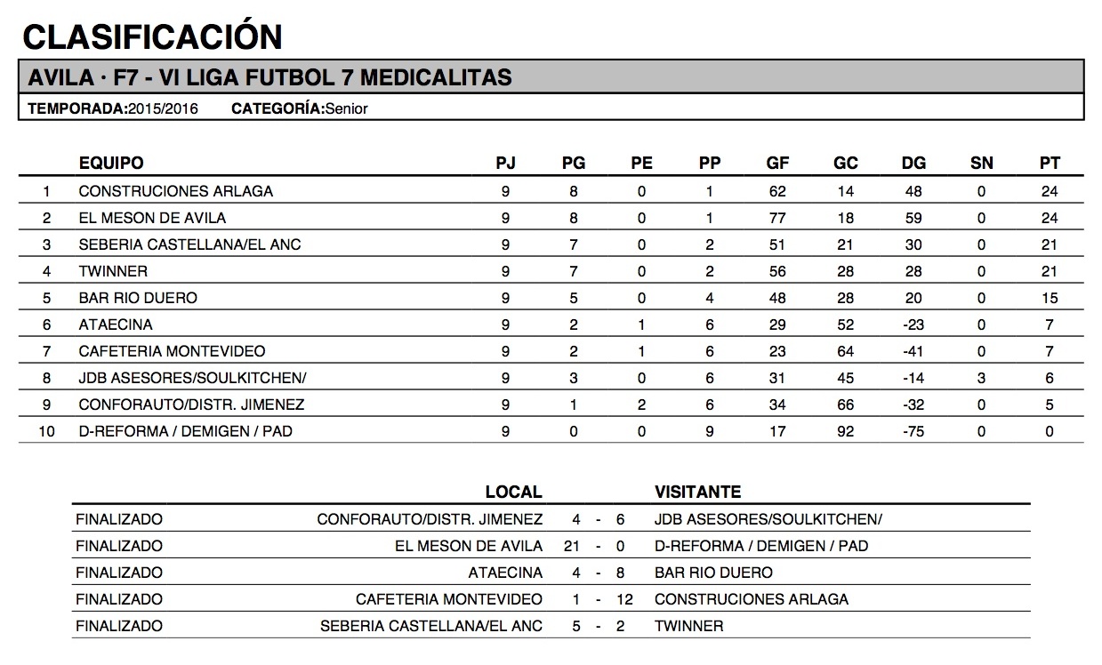 @deportesavila / Continúan igualados a puntos los dos primeros de la clasificación de la VI Liga de Fútbol 7 Medicalitas. La lucha por la cabeza entre Construcciones Arlaga y El Mesón de Ávila sigue latente, de forma que en la pasada jornada goleaban de forma aplastante a sus rivales, Cafetería Montevideo y D-Reforma/Demigen, respectivamente.