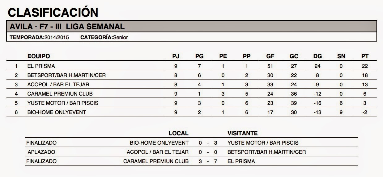 @deportesavila / La tercera edición de la liga semanal de fútbol 7 recuperaba esta semana una de los suspendidas por las inclemencias meteorológicas, concretamente era la novena jornada, donde se aplazaba de nuevo el encuentro entre Acopol/Bar El Tejar y Betsport/Bar Hermanos Martín, y se daba por ganado por 0-3 a Yuste Motor/Bar Piscis al no presentarse el rival Bio-Home Only Event.