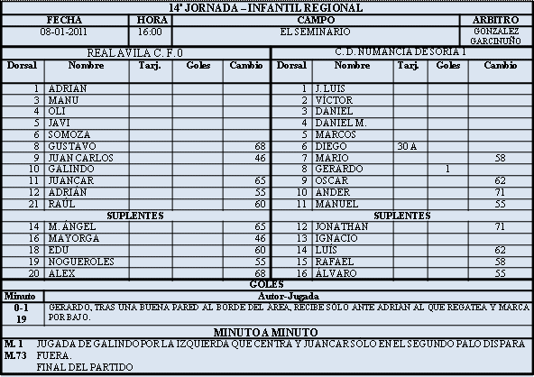 Poco se puede decir de un partido en el que tan sólo ha habido dos ocasiones claras de gol una para el equipo local en el primer minuto de juego, centro de Galindo desde la izquierda y Juancar sólo en el segundo palo dispara fuera, y otra para el Numancia en el minuto 20, pared al borde del área y Gerardo se planta solo ante Adrián al que regatea y marca por bajo. Y ahí se acabó el encuentro, a partir de este momento todo el fútbol se desarrolló en el centro del campo con muchas imprecisiones por ambos equipos.