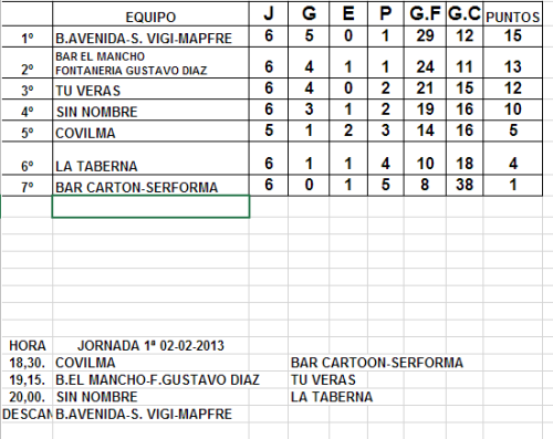 Por último, ‘Bar Avenida/S. Vigi Mapfre’ y ‘Bar El Mancho/F. Gustavo Díaz’ se veían las caras luchando por quien se quedaría la primera plaza del campeonato. Un partido sin ninguna clase de conflictos dio como vencedor a Bar Avenida/S. Vigi Mapfre, imponiéndose a los veteranos de la liga por 4-1. Gracias a esta victoria también consiguen el título de campeones de la primera vuelta, quedando la clasificación del siguiente modo: