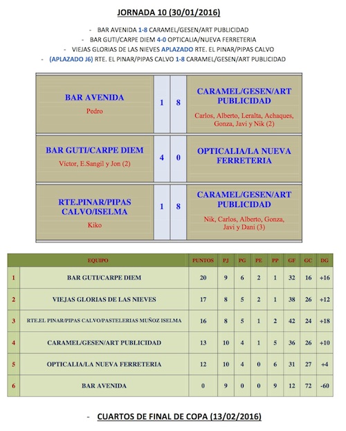 La décima jornada de la competición vio como Caramel/Gesen/Art Publicidad sumaba dos victorias al jugar, además del partido que le correspondía según el calendario con el colista Bar Avenida, el aplazado de la sexta jornada ante Restaurante El Pinar que sufría su segunda derrota de la temporada, perdiendo la opción de haberse colocado segundo.