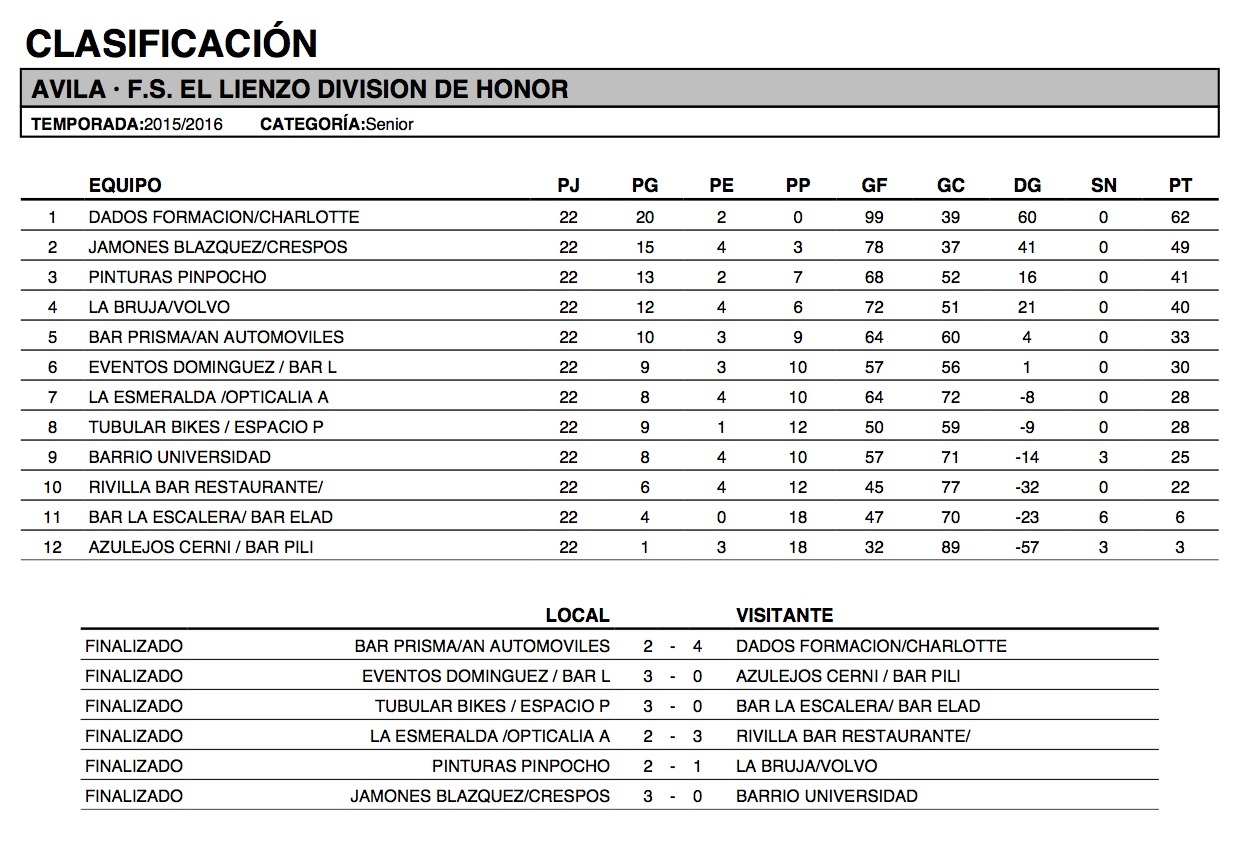 En la División de Honor se ha paseado el Dados Formación/Charlotte que ya se hizo con el título hace varias jornadas. El equipo campeón de la máxima categoría no ha perdido encuentro alguno, cediendo únicamente un par de empates, con veinte victorias en su haber. Ha sacado 13 puntos al segundo clasificado, Jamones Blázquez/Crespos, que superaba en nueve al tercero, Pinturas Pinpocho. Tras éste y a un punto, La Bruja/Volvo, con una ventaja de siete puntos respecto al quinto, Bar Prisma/AN Automóviles. Tres equipos han quedado con una diferencia de dos puntos, Eventos Domínguez/Bar La Bahía, La Esmeralda/Opticalia Ávila y Tubular/Espacio Pádel. Por la parte baja, han finalizado Barrio Universidad y Rivilla Bar Restaurante, y en las dos últimas posiciones y con escaso bagaje de puntos, Bar La Escalera/Bar Eladio y Azulejos Cerni/Bar Pili.