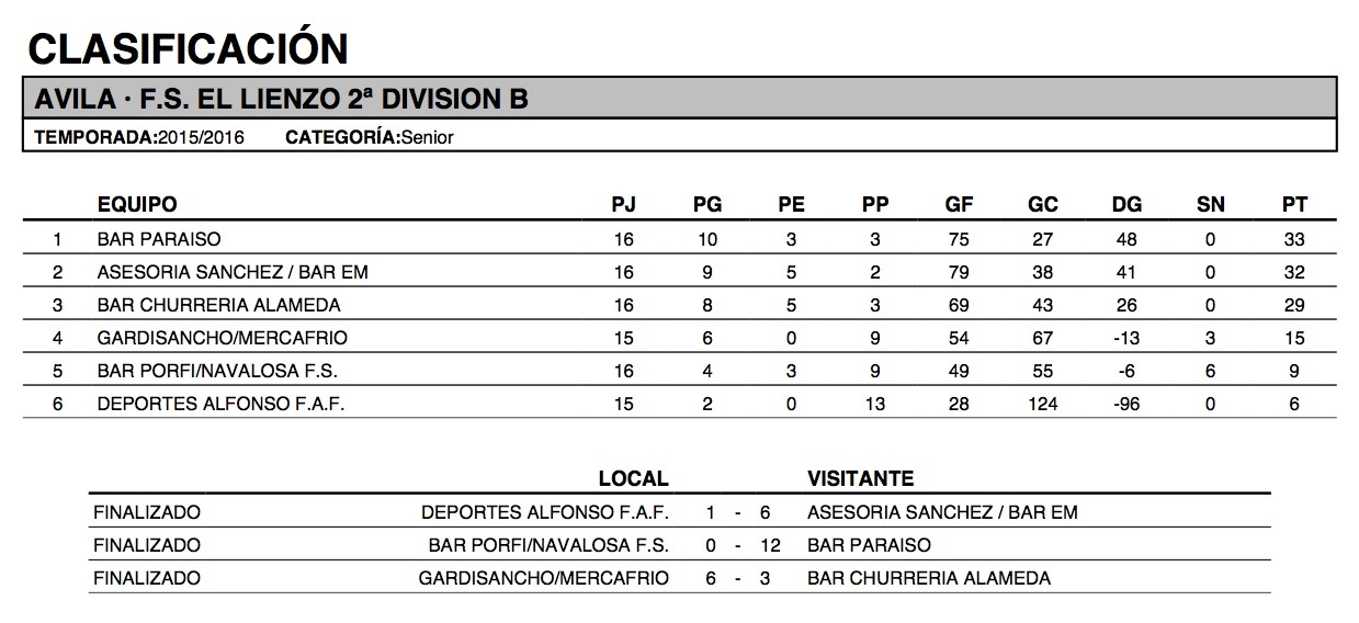 La lucha en la última categoría de la competición sigue latente. El líder Bar Paraíso goleaba a Porfi/Bar Navalosa F.S., produciéndose un cambio en la segunda posición que ahora ostenta Asesoría Sánchez/Bar Emiliano, gracias a su victoria sobre Deportes Alfonso F.A.F. y a que quien hasta ahora ocupaba ese lugar, Bar Churrería Alameda, perdía con Gardisancho/Mercafrío.