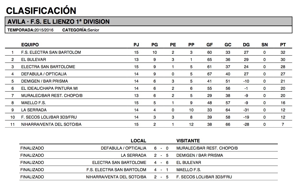 Sube hasta la quinta plaza Demigen/Bar Prisma tras superar a La Serrada, cediendo ese lugar El Ideal/Chapa Pintura Miguel Ángel por corresponderle jornada de descanso. El duelo de la parte baja de la tabla se resolvió a favor de Frutos Secos Loli/Bar 3D3 en detrimento de Niharra/Venta del Soto.