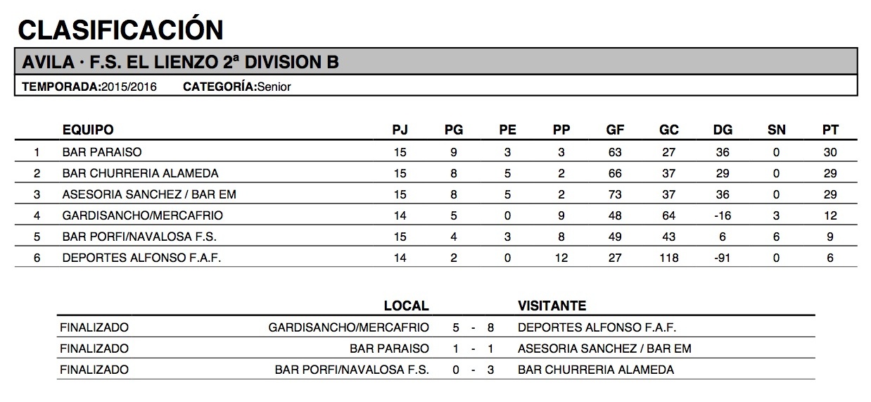 Los dos primeros clasificados, Bar Paraíso y Asesoría Sánchez/Bar Emiliano fijaban tabla, descendiendo un puesto el último en favor de Bar Churrería Alameda que conseguía vencer a Bar Porfi/Navalosa F.S.
