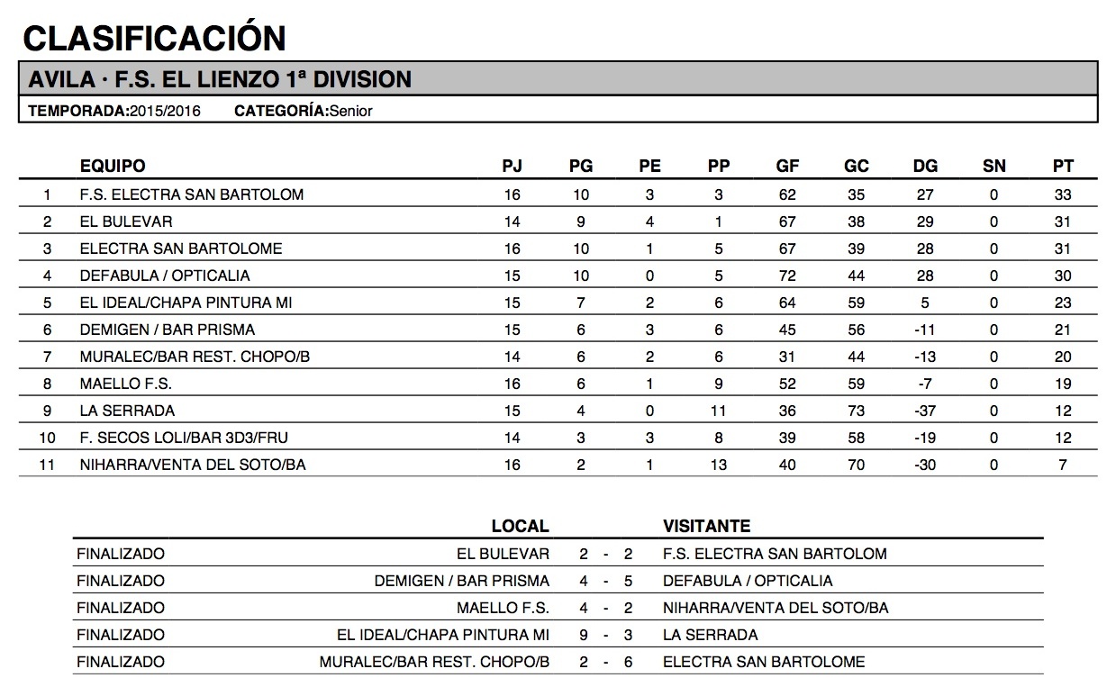 A su vez, Defábula/Opticalia vencía a Demigen/Bar Prisma, con triunfo de Maello F.S. sobre el colista, Niharra/Venta del Soto, y de El Ideal/Chapa Pinturas Miguel Ángel sobre La Serrada. Descansó Frutos Secos Loli/Bar 3D3.