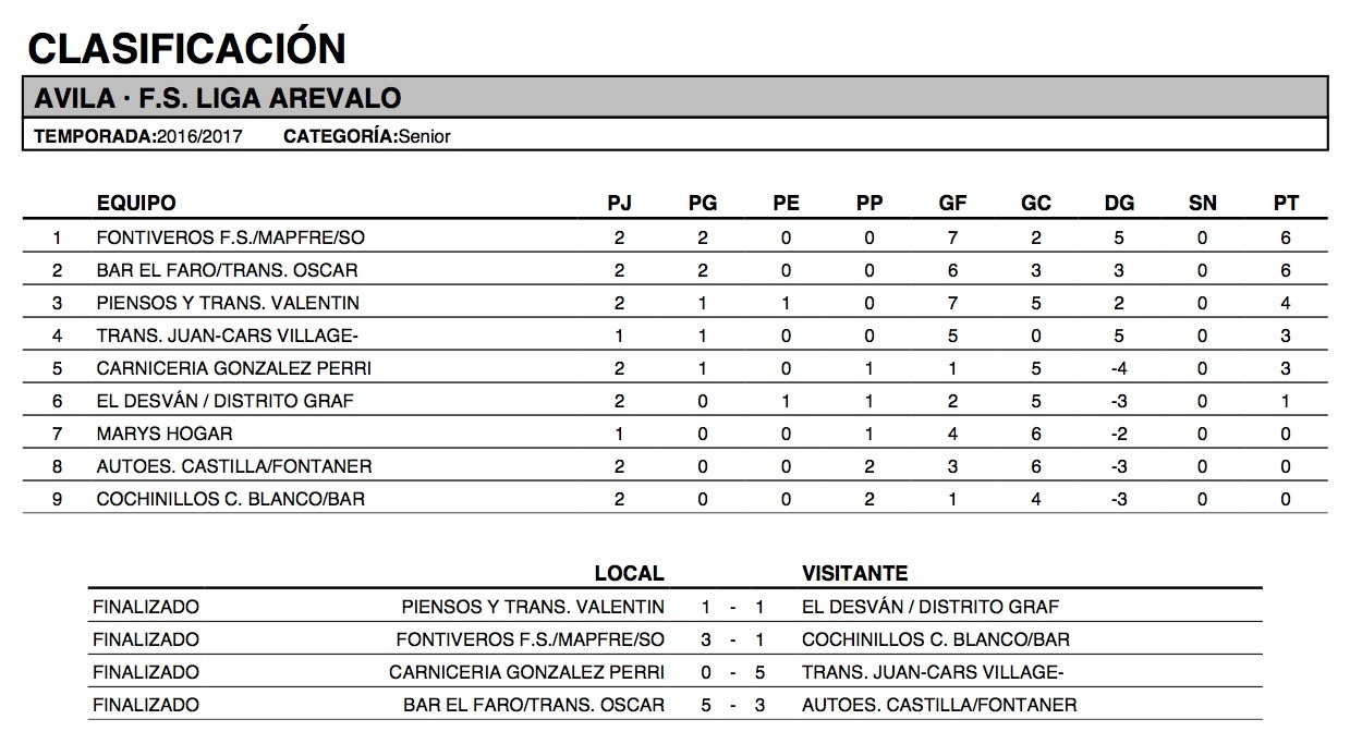 @deportesavila / Gracias a sus victorias sobre Cochinillos C. Blanco/Bar El Elegante/Palacios de Goda y Autoescuela Castilla/Fontanería Jorge/Langa, los equipos de Fontiveros F.S./Mapfre/Somocar y Bar El Faro/Transportes Óscar Jiménez, son primero y segundo, respectivamente, en la clasificación de la liga de fútbol sala de Arévalo, compartiendo el liderato con seis puntos cada uno.
