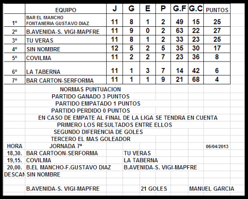 Parecía que ‘Vigi’ protagonizaría un partido cómodo cuando en los primeros minutos anotaba dos goles consecutivos. Quizá un exceso de confianza hizo que ésto no fuera así y dio un poco de vida al Cartoon que conseguiría igualar el marcador rápidamente. Con este resultado intentarían aguantar el marcador ante un rival que buscaba sin cesar el gol pero no lo conseguía, gracias también al guardameta del Cartoon que paró un penalti. En las jugadas siguientes al penal fallado, Vigi conseguiría el ansiado gol por partida doble poniéndose 4-2 por encima. En los segundos 20 minutos, con más comodidad, Seguros Vigi Mapfre anotaría otros cuatro tantos más.