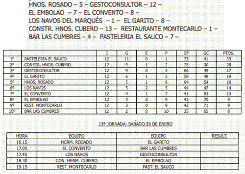Precisamente el próximo rival de Pastelería El Saúco fue el que protagonizó la goleada de la jornada al recibir un 13-1 por parte del segundo clasificado, Construcciones Hermanos Cubero. Los últimos campeones no dieron ninguna opción y golearon sin piedad a su rival antes de verse las caras con El Embolao, el último rival de la parte baja que les queda a la espera de afrontar su particular ‘etapa alpina’.