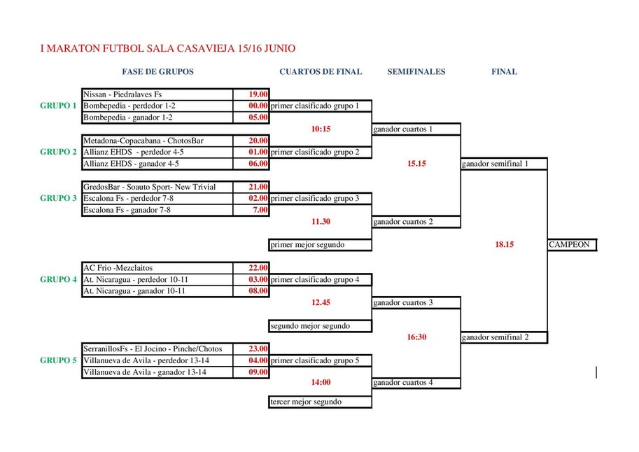 23.00 Serranillos FS Vs ElJocino-Pinche/Chotos // 04.00 VillanuevaDeAvila Vs Perdedor (13-14) // 09.00 Villanueva de Avila Vs Ganador (13-14)