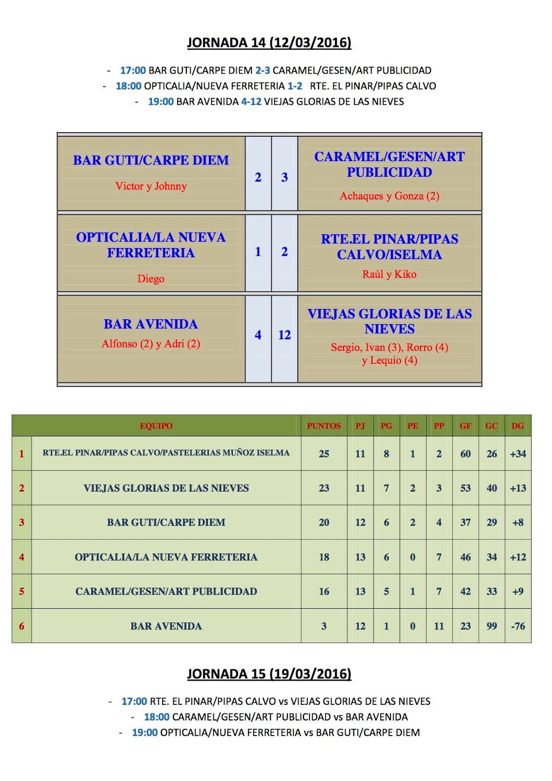 @deportesavila / Continúa al frente de la clasificación de la Liga Abulense de Fútbol Sala el Restaurante El Pinar/Pipas Calvo/Pastelería Muñoz Iselma, tras catorce jornadas disputadas. El líder vencía por tan solo un gol de diferencia a Opticalia/La Nueva Ferretería. Mantiene una ventaja de dos puntos respecto al segundo clasificado que ahora es Viejas Glorias de las Nieves –goleador del farolillo rojo Bar Avenida–, descendiendo al tercer lugar Bar Guti/Carpe Diem, que salía derrotado por Caramel/Gesen/Art Publicidad.