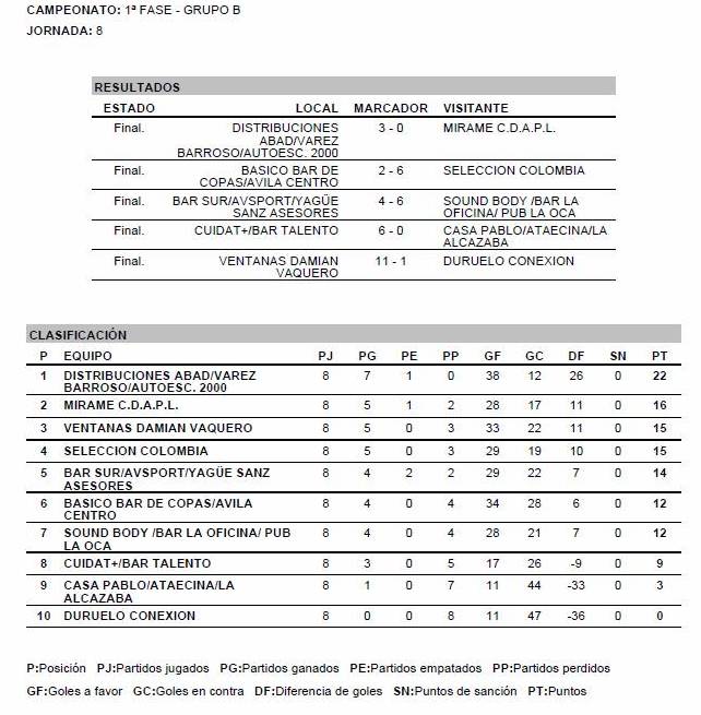 Ventanas Damián Vaquero dio buena cuenta del colista, Duruelo Conexión, y le endosó un 11-1. Se coloca en cuarta posición la Selección de Colombia, que superó por 2-6 a Básico Bar de Copas/Ávila Centro, y Cuidat +/Bar Talento goleó 6-0 a Casa Pablo/Ataecina/La Alcazaba, mientras que el resultado más ajustado de la jornada se dio en el Bar Sur/AV Sport/Yagüe Sanz Asesores-Sound Body/Bar La Oficina/Pub La Oca, con victoria para éste por 4-6.