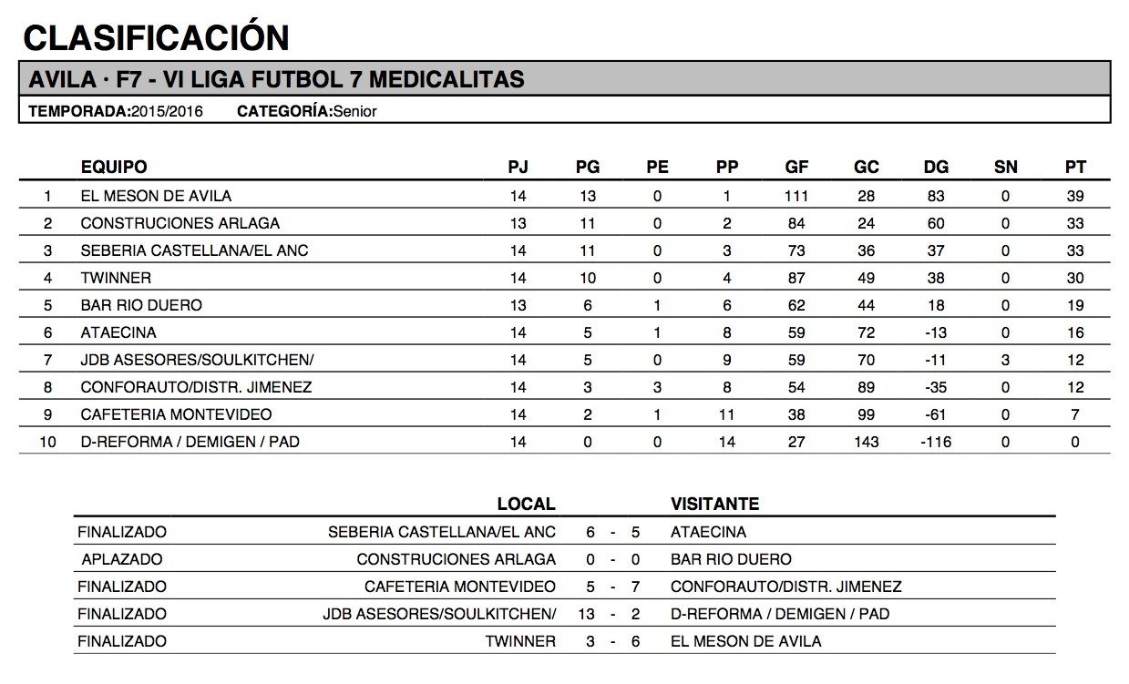 @deportesavila / Se disputó una nueva jornada de la VI Liga de Fútbol 7 Medicalitas sin que se produjera ninguna variación en la clasificación pese a aplazarse el partido entre Construcciones Arlaga y Bar Río Duero. La no celebración de este encuentro hace que el líder, El Mesón de Ávila, obtenga seis puntos de ventaja sobre el segundo clasificado, tras derrotar por 3-6 a Twinner.