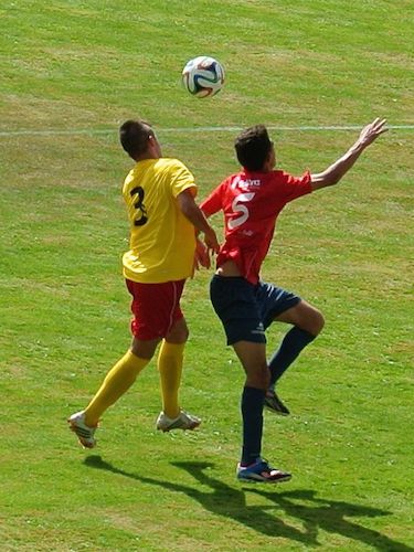 | Rober trata de llegar al balón ante la oposición de un contrario |