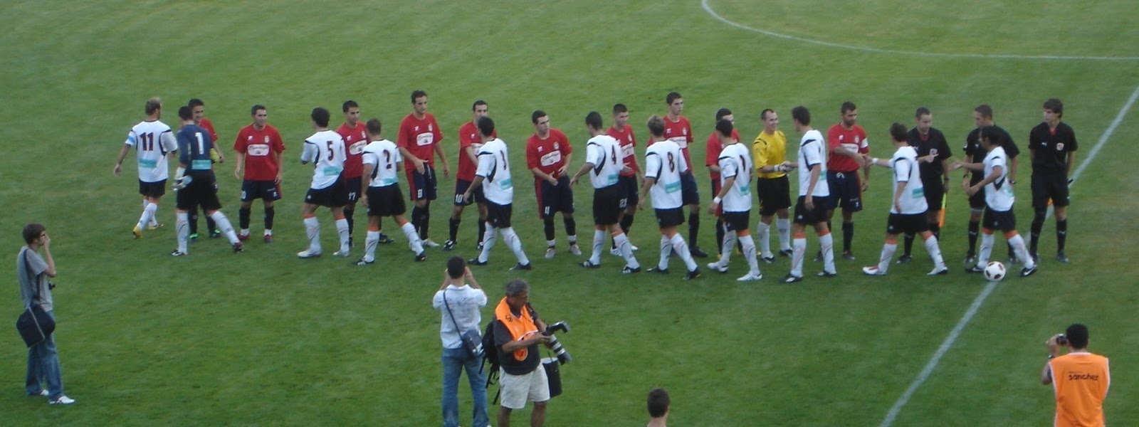 Los jugadores de ambos equipos se saludan antes de comenzar el partido.