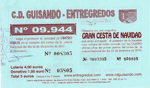 El Club Deportivo Guisando-Entregredos en su primer año de andadura cuenta con lotería de Navidad en el número 9.944, que espera le traiga la suerte a la familia futbolística guisandera. Las participaciones tienen el precio de cinco euros, cuatro para el sorteo del 22 de diciembre de 2010 y uno para la rifa de una gran cesta de Navidad con la que será agraciado el poseedor de la papeleta cuyo número coincida con las cuatro últimas cifras del Gordo.