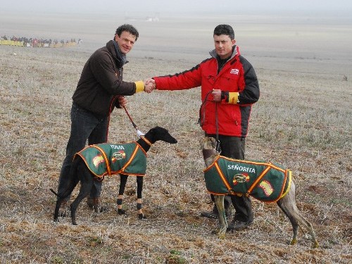 La niebla ha respetado hoy a la organización y la mano pudo ponerse en marcha sobre las 11:30 horas y en poco más de media hora la representante de Castilla La Mancha, Bimba, y Señorita, galopaban en pos de la gloria. Sólo bastó una liebre y en una carrera de 1’13”, Señorita se mostraba superior y con tres pañuelos blancos se alzaba con la victoria y con la clasificación para la gran final. En la jornada de ayer, Señorita había logrado el primero de los dos puntos necesarios para la final.