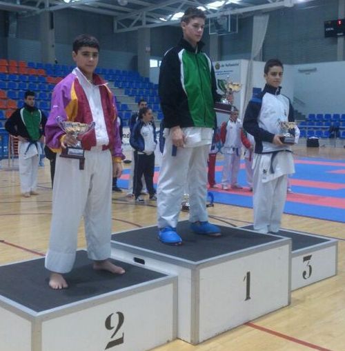 | Carlos Jiménez a la izquierda en el podio, plata kumité cadete en el Interregional |