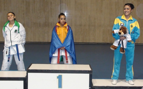| Karen Jiménez a la derecha, con la copa de tercera en kumité júnior |
