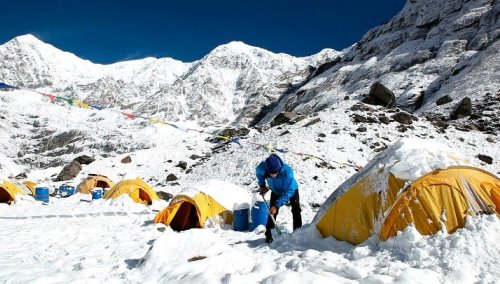 | Carlos Soria, pala en mano, quitando la nieve sobre las tiendas en el campo base |