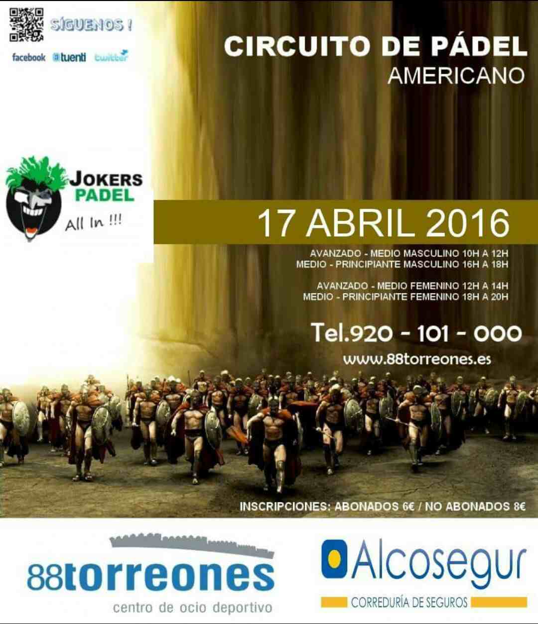 @deportesavila / De la mano de Alcosegur/Jokers Pádel, el próximo domingo 17 de abril se celebrará una nueva jornada del Circuito Americano 88 Torreones de pádel. Algunas de las categorías ya están completas, pero aún hay tiempo para apuntarse a las plazas vacantes.