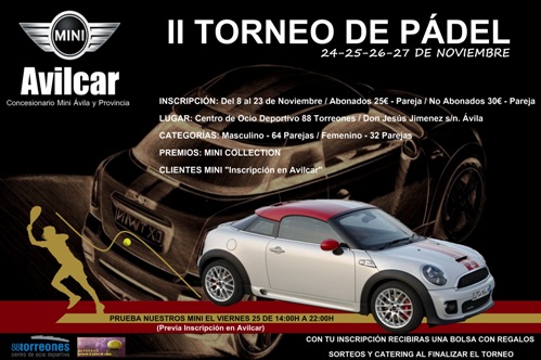 Los próximos días 24 al 27 de noviembre se disputa la segunda edición del torneo de pádel ‘Mini Avilcar’, organizado por el Centro Deportivo 88 Torreones y Eltedeca, que cuenta con dos categorías: masculina, hasta un máximo de 64 parejas, y femenina, hasta 32 parejas.
