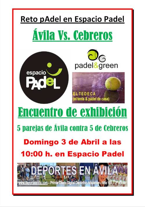 A petición de los cebrereños la confrontación se llevara a efecto el próximo domingo 3 de abril, a partir de las 10 horas en el mencionado Espacio Pádel situado en el Polígono de Las Hervencias. El choque pretende ser una comunión entre los padelistas abulenses, que podría tener su encuentro de vuelta en Cebreros durante el fin de semana siguiente.