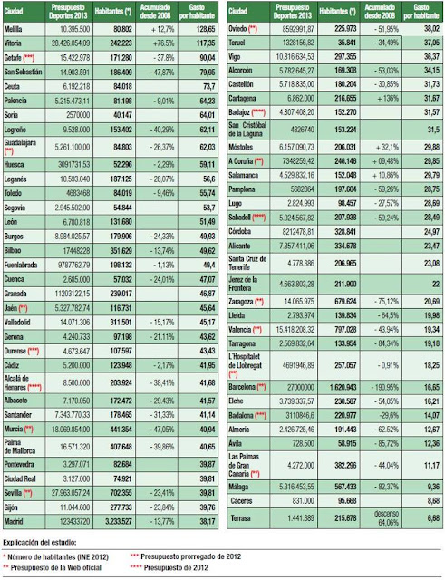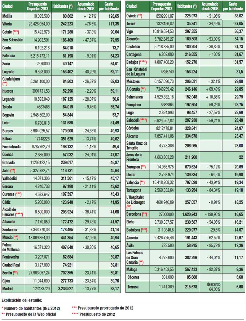 @deportesavila / La revista Deportistas publica en su número 51, correspondiente a los meses de abril y mayo de este año, las cantidades que destinan al deporte los ayuntamientos de las capitales de provincia y ciudades españolas con más de 150.000 habitantes. Los 728.500 euros que según la citada publicación corresponden al presupuesto de deportes para 2013 son la cifra más baja de todo el ranking de las 66 poblaciones de España a que hace referencia el informe. Por número de habitantes, la capital abulense ocupa el quinto lugar por la cola, destinando tan sólo 12,36 euros por habitante frente a la media en España que es de 34,29.