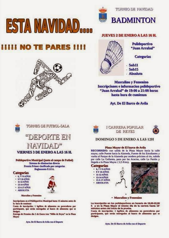@deportesavila / Durante la primera semana del nuevo año 2014, el Ayuntamiento de El Barco de Ávila comienza su calendario deportivo con tres competiciones de carácter popular, benéfico y solidario, ya que los inscritos en las mismas deberán aportar algún alimento no perecedero que irán destinados a Cáritas barcense.