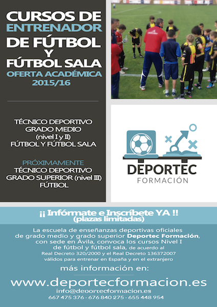 @deportesavila / La Consejería de Educación ha convocado para el próximo 25 de septiembre las pruebas de carácter específico para el acceso al Grado Medio de las Enseñanzas de Técnico Deportivo en Fútbol y Fútbol sala, que por primera vez se podrán realizar en Ávila capital a través de Deportec Formación. Dicha convocatoria se ha publicado en el Boletín Oficial de Castilla y León de fecha 29 de julio de 2015.