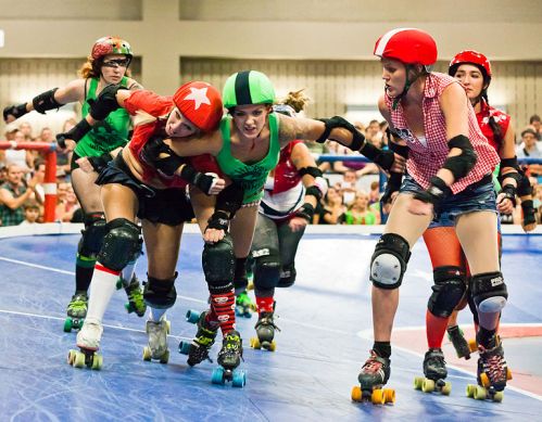 El roller derby se disputa entre dos equipos formados por cinco personas cada equipo, el mismo número que un conjunto de baloncesto. Pero para jugar un partido –con una duración total de 60 minutos, con dos períodos de 30 divididos en fases con un máximo de dos minutos– se necesitan 15 chicas porque tienen que irse alternando y rotando. Es un deporte en patines especiales de cuatro ruedas, con protecciones en codos, rodilleras, protector bucal y casco. El roller derby se corre en una pista oval plana, como un velódromo pero más pequeño, siendo de unas dimensiones aproximadas a una cancha de fútbol sala. El problema de no disponer de una pista de estas características puede salvarse colocando unas cintas que delimiten la zona de juego sobre una superficie plana que deslice como puede ser la de parqué.