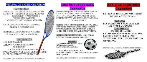 Con arraigo entre las actividades deportivas desarrolladas en la localidad, no faltan a su cita anual las ligas de pádel, fútbol sala y frontenis que el Área Municipal de Deportes de Cebreros organiza los próximos meses y para las que tiene abierto el plazo de inscripción hasta el próximo sábado 17 de noviembre en el Polideportivo Municipal.