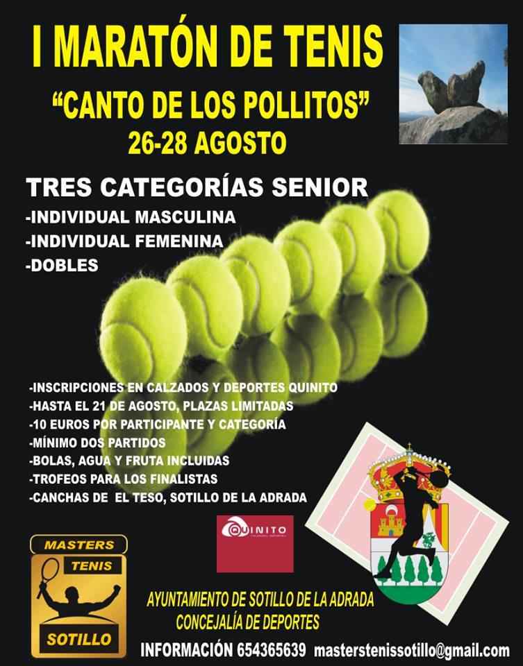 @deportesavila / Un evento único en la provincia es el I Maratón de Tenis ‘Canto de los Pollitos’ que tendrá lugar en las canchas de El Teso de Sotillo de la Adrada los días 26 al 28 de agosto, organizado por la Concejalía de Deportes del Ayuntamiento, con cuadros individuales y dobles.
