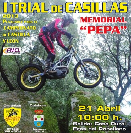 Alba Palacio / El próximo domingo 21 de abril se va a disputar en Casillas la primera edición del trial que lleva el nombre de esta localidad abulense, ‘Memorial Pepa’, organizado por el Moto Club Valle del Tiétar. En esta prueba, la segunda del calendario del Campeonato de Castilla y León de Trial 2013, participarán cinco categorías para adultos (TR1, TR2, TR3, TR4 y TR4i) y dos para alevines (TRAa y TRAc)